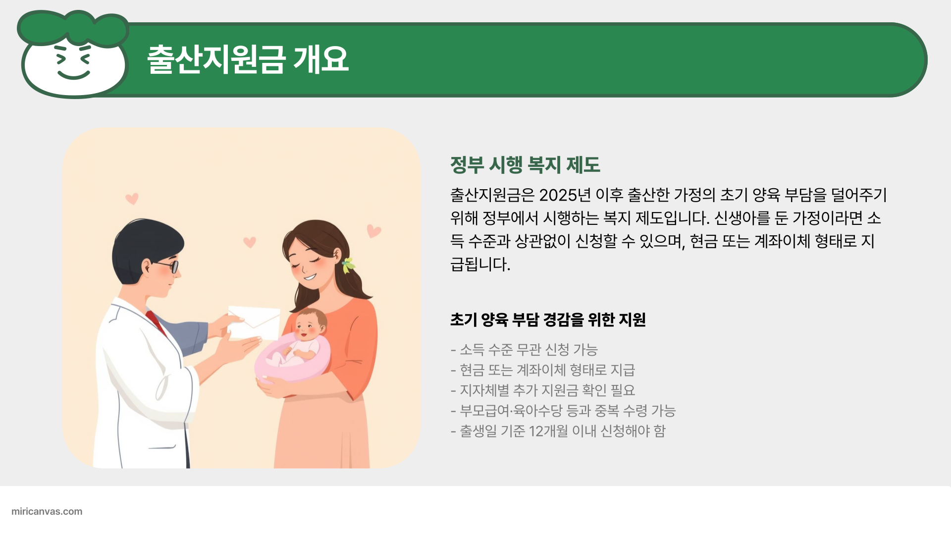 출산지원금은 2025년 이후 출산 가정의 초기 양육 부담을 완화하기 위해 정부(또는 지자체)가 지원하는 복지 제도입니다. 소득 수준과 무관하게 신청 가능하며, 현금 또는 계좌이체 방식으로 지급됩니다.