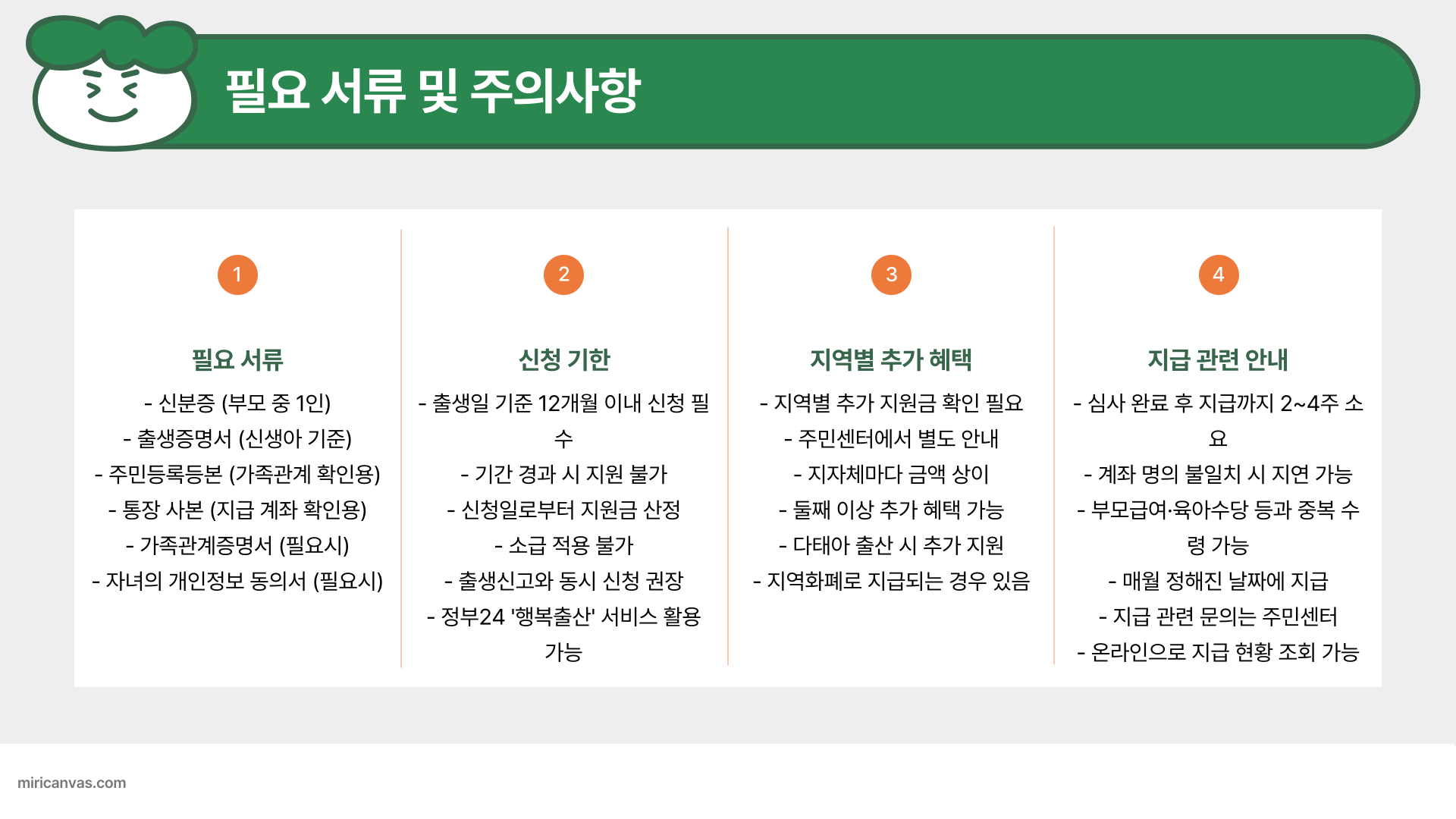 - 출생일로부터 12개월 이내 신청해야 지급 가능